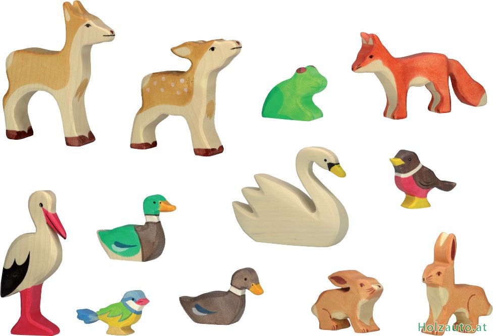 BeschreibungDas Set enthält 12 Tiere - Reh, Kitz, Frosch, Fuchs, Storch, Erpel, Schwan, Rotkelchen, Blaumeise, Ente, 2x Hase. Größe:
