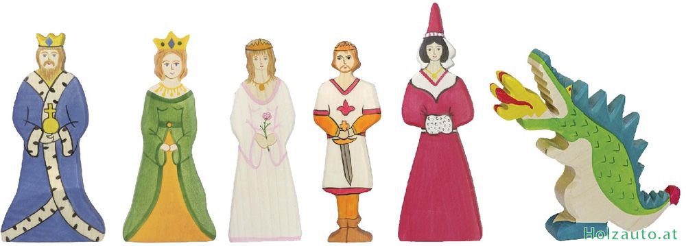 BeschreibungDas Set enthält 6 Figuren - König, Königin, Prizessin, Prinz, Burgfräulein und Drache grün. Größe: