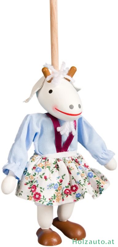 Der Körper, Kopf, Beine und Arme sind aus Holz gefertigt, das Kostüm aus einem hochwertigen Baumwollenstoff.