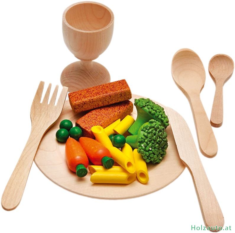 6 Teile: Messer, Gabel, kleiner und größer Löffel, Teller, Becher.