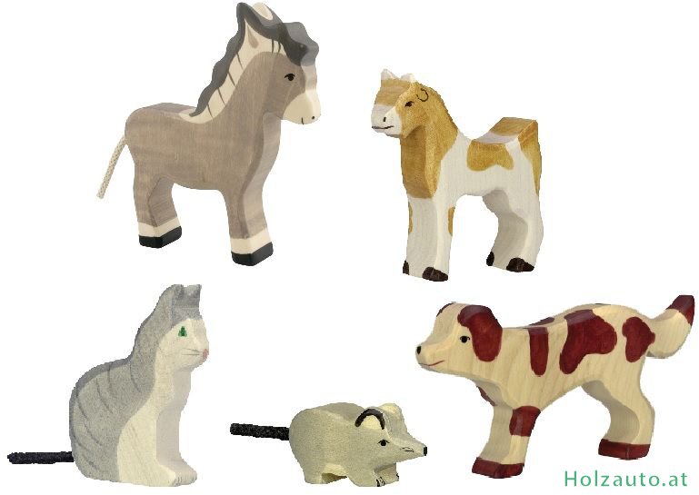 BeschreibungDas W102B Haustiere Set enthält 5 Tiere - Esel, Ziege, Hofhund, Maus und Katze sitzend.