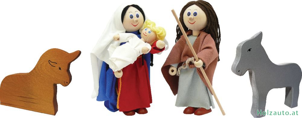 Das Set besteht aus 2 Biegepuppen Maria und Jofes, Jesuskind und Krippe und 2 Tieren - Ochse und Esel.