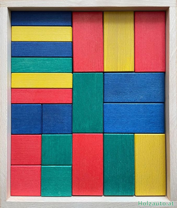 Dieser Baukasten enthält 21 farbige Buchenholz-Steine.