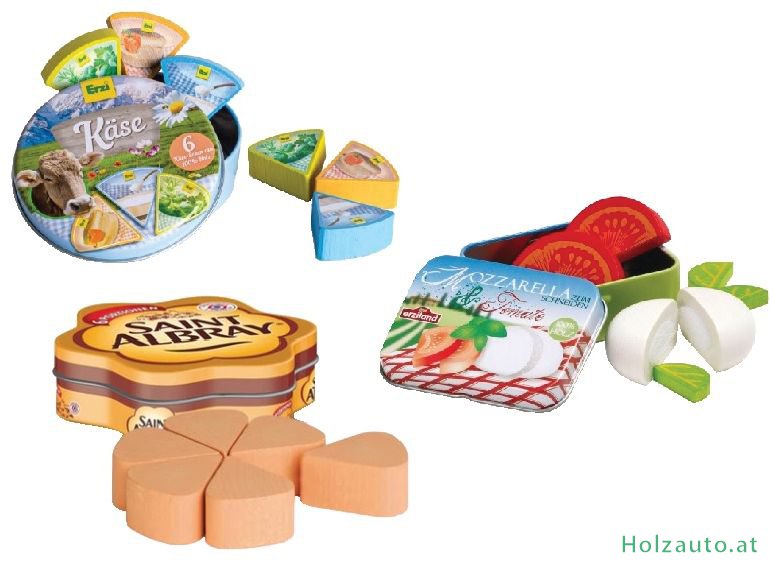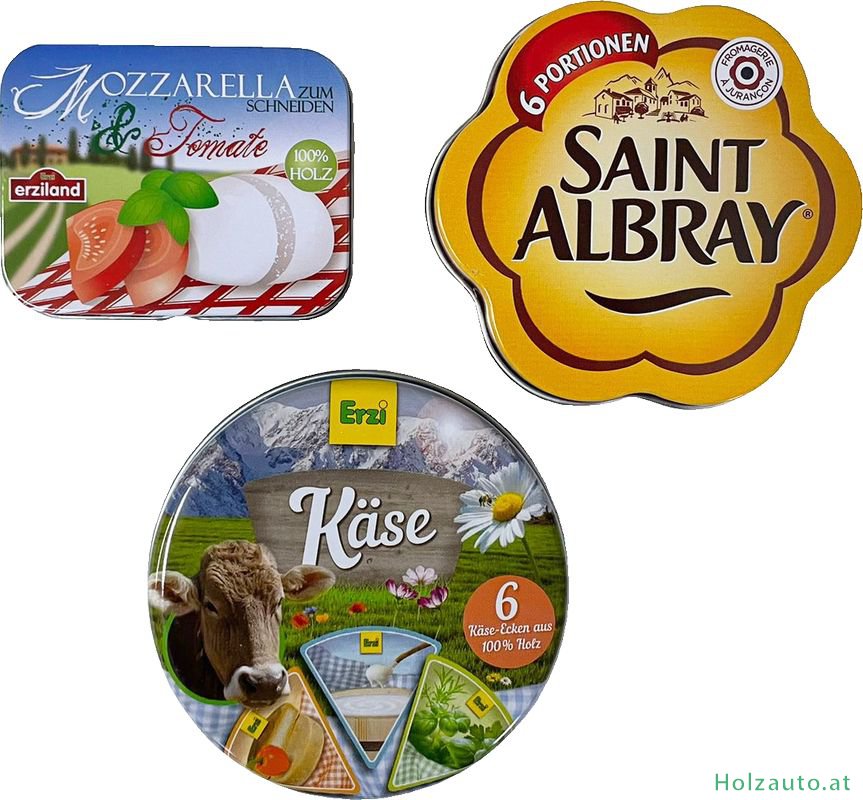 Ein Set mit 3 Käsen in der Dose - Saint Albray, Mozzarella und 6 verschiedene Käseecken.