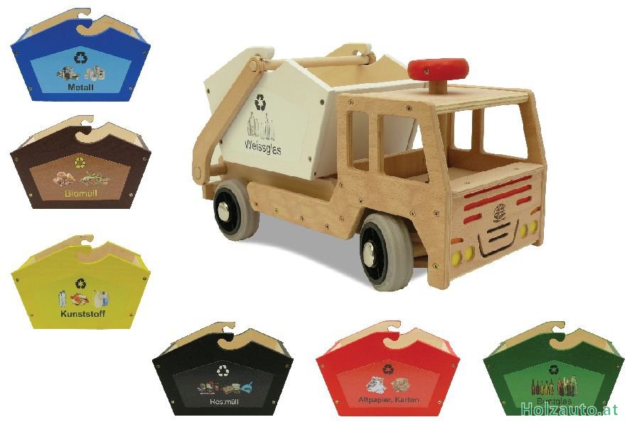 Muldenkipper mit 7 Mulden - Mulde rot PAPIER, Mulde gelb - KUNSTSTOFF, Mulde schwarz RESTMÜLL, Mulde braun BIOMÜLL, Mulde grün BUNTGLAS, Mulde weiß WEIßGLAS und Mulde blau METALL