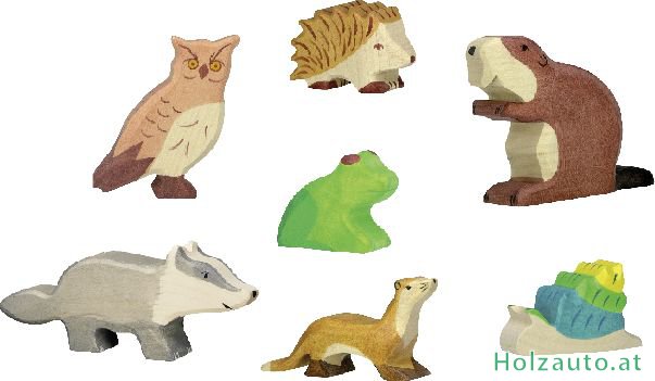 Das Set enthält 7 Tiere - Uhu, Schnecke, Frosch, Igel, Marder, Dachs und Rotkelchen.